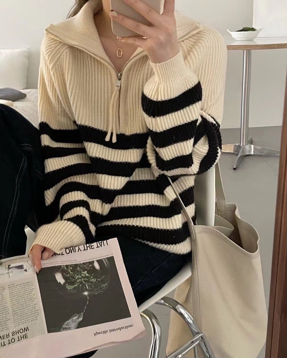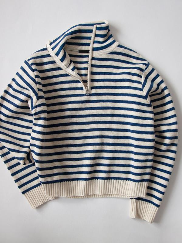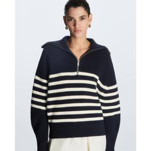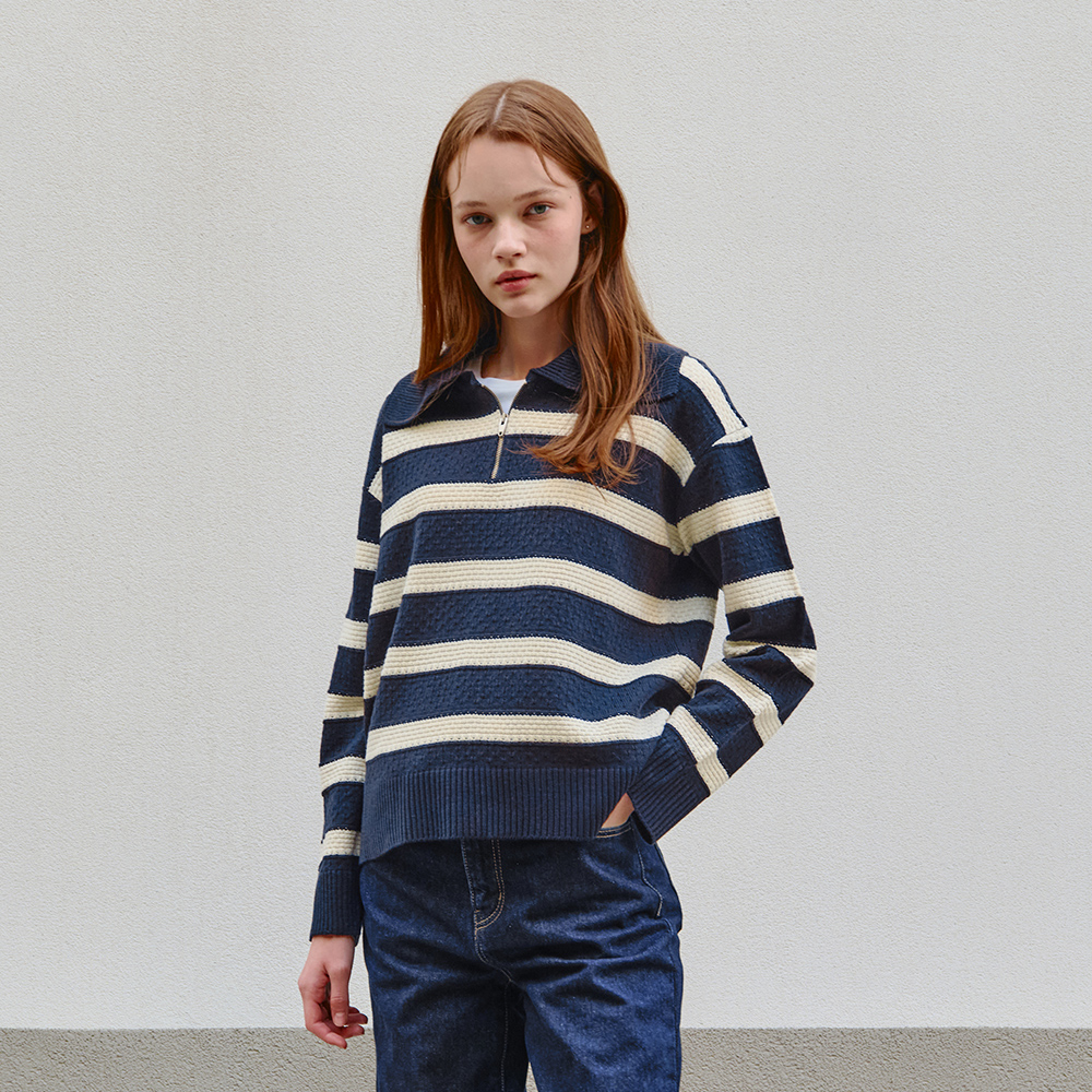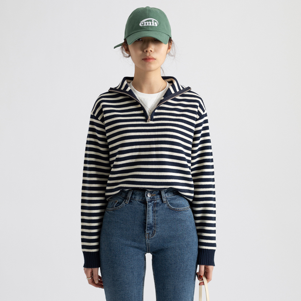 울 혼방의 원단으로 높은 퀄리티가 느껴지는 니트예요 :-) 심플한 디자인이지만 스트라이프 배색과 골지 짜임으로 밋밋하지 않아요. 래글런 소매라 여리여리해 보이는 아이템이랍니당 💙 지퍼를 끝까지 잠가서 하이넥으로 연출하실 수 있고, 열어서 입으시면 얼굴이 작아 보이는 효과도 있어요 👍 미니스커트와 걸리시하게 스타일링해도 좋고, 하프 데님 팬츠나 슬랙스등 캐주얼하게 스타일링해도 좋으실 거 같아요 🤗