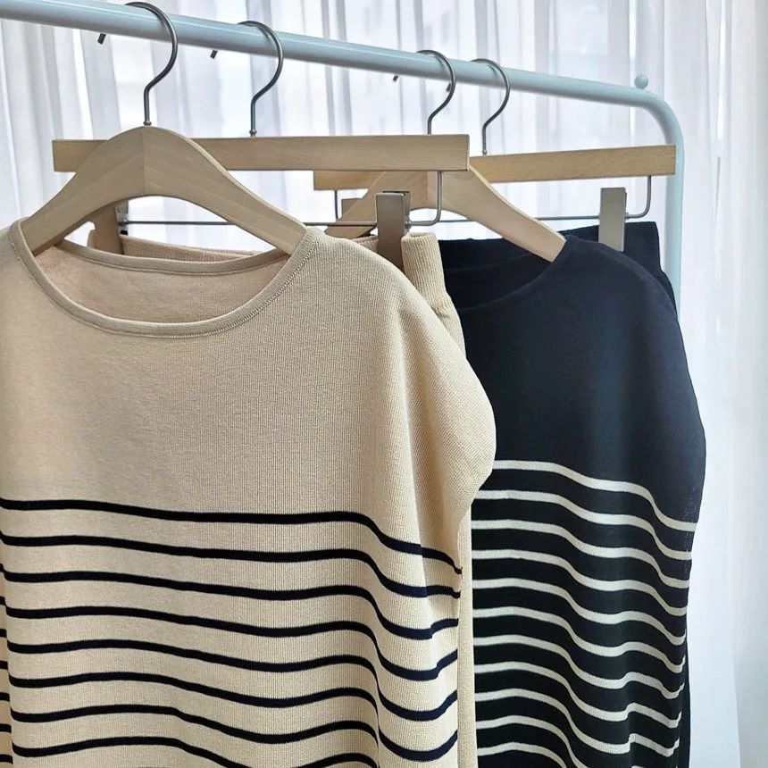 단품으로 혹은 세트로 입기 좋은 스트라이프 니트 세트에요. 레이온과 나일론 혼방의 여름 니트이고요, 어깨를 살짝 가려주는 민소매로 시원하게 입기 ~ 바지 세트로 편안하게 데일리로 활용하기 좋은 착장입니다~👍