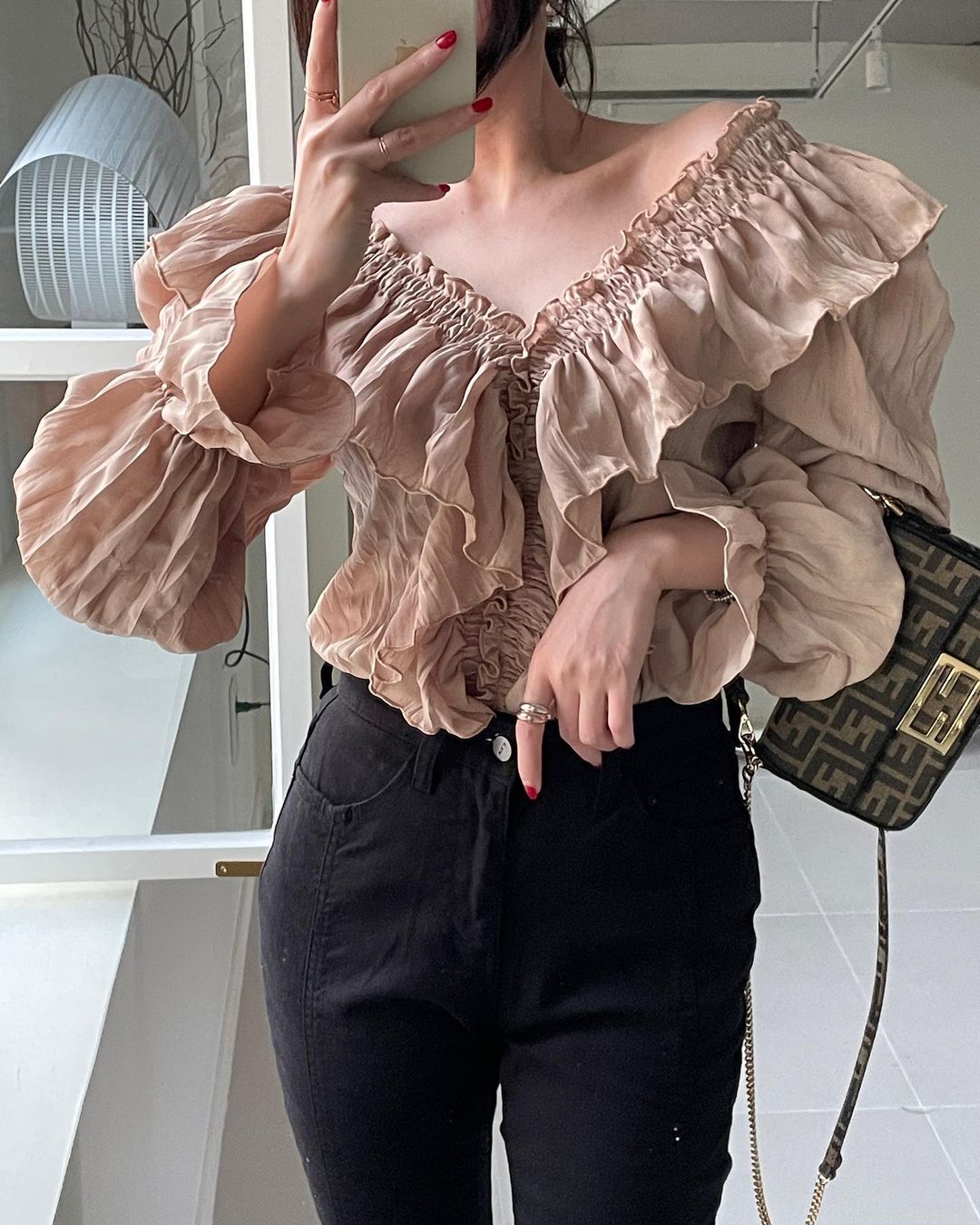 윤스토어 여름 여성 브이 캉캉프릴 블라우스22,900