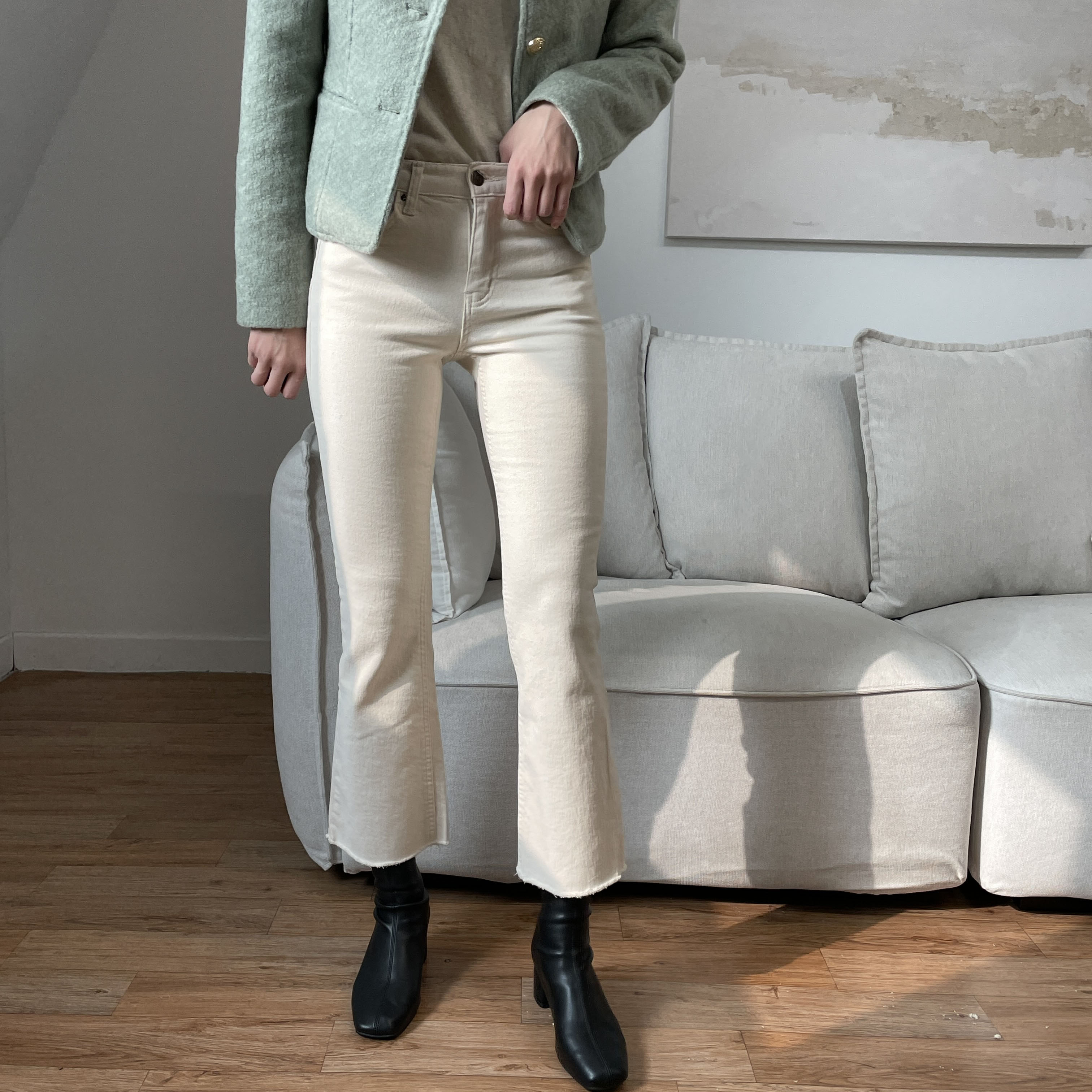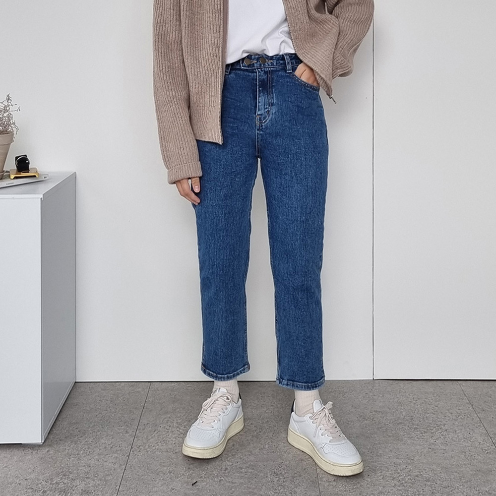 하이웨스트 세미부츠컷 라인으로 다리가 길어 보이고 투 버튼 디테일로 포인트를 주었어요!