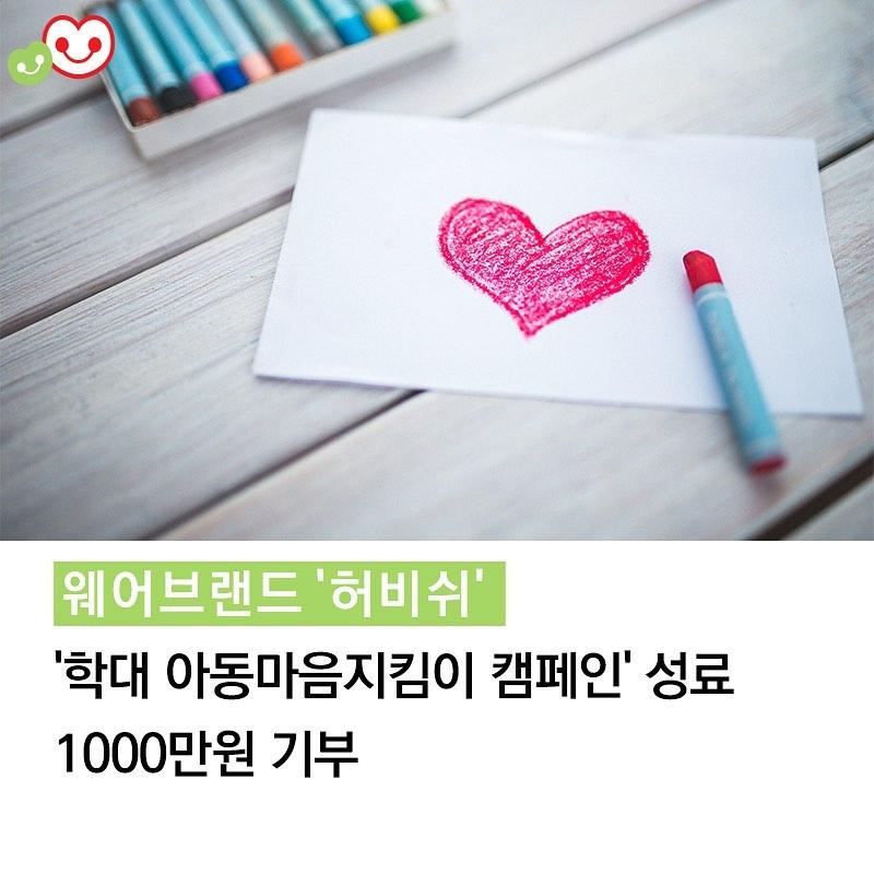 편안함과 아름다움을 추구하는 라운지 웨어 브랜드‘허비쉬’(대표 조연정)에서 소비자 참여형 기부 캠페인 ‘학대 아동 마음 지킴이 캠페인’을 성료하고 1,000만원을 기부했습니다💚