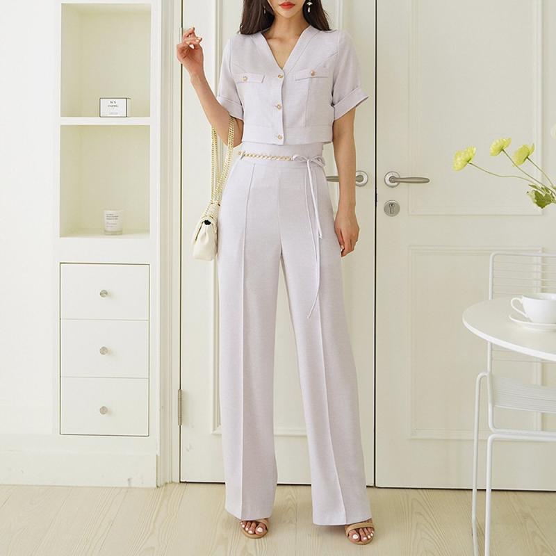 크롭 기장감 반소매 자켓과 와이드 롱팬츠