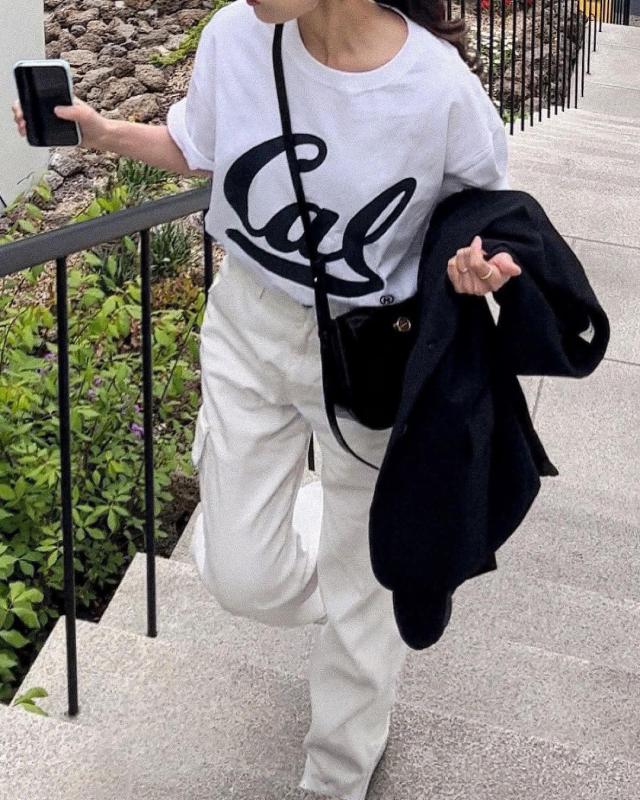 저는 모나미룩으로다가 깔끔한 레터링이 있는 흰 반팔티에