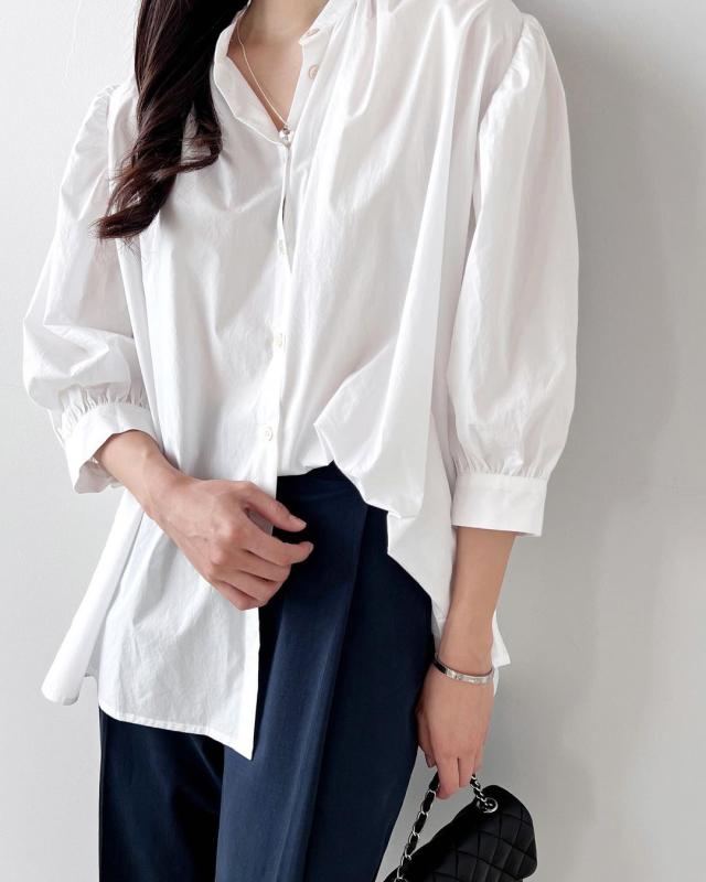 숄더라인과 소매에 잡힌 셔링 디테일은