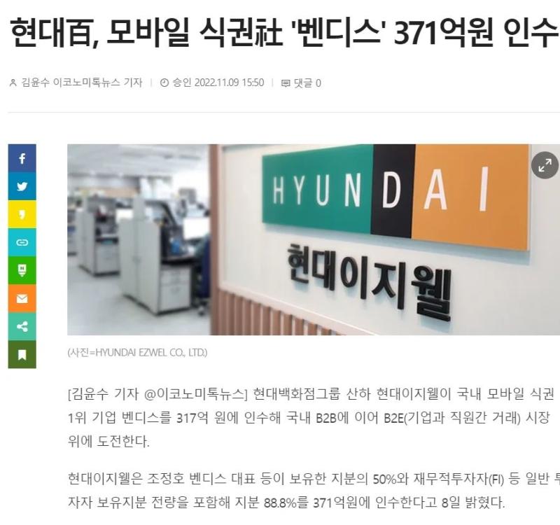 이번 벤디스 인수를 통해 기업이 임직원들의 식대를 지급하는 ‘식대복지사업’으로 사업 영역을 확장해, 국내 B2B(기업간 거래)뿐만 아니라 B2E(기업과 직원간 거래) 시장 1위 기업으로서 초석을 다지겠다는 구상이라고 하네요.