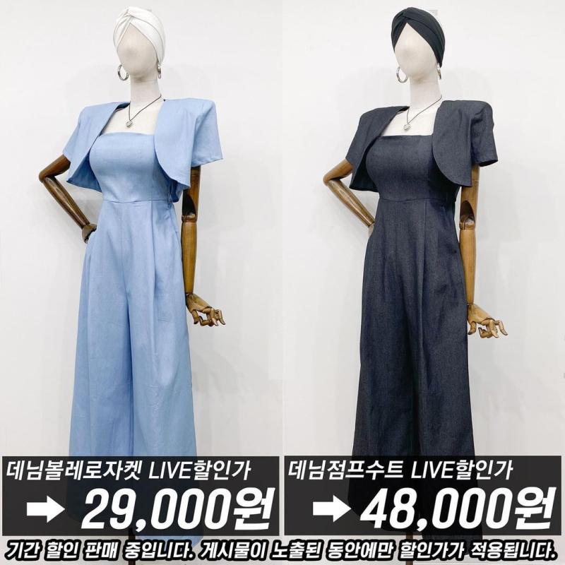 [데님볼레로자켓]29,000원✔️ [데님점프수트]48,000원✔️ 시원한 데님원단 시크한 무드 ~!!✨ 제대로된 여름셋업 하이웨스트 디자인의 와이드 팬츠로 누구나 입었다하면 모델핏가능👌🏻 노카라볼레로자켓은 따로 캉캉스커트나 화이트데님팬츠랑 같이 코디해도 좋아용🖤